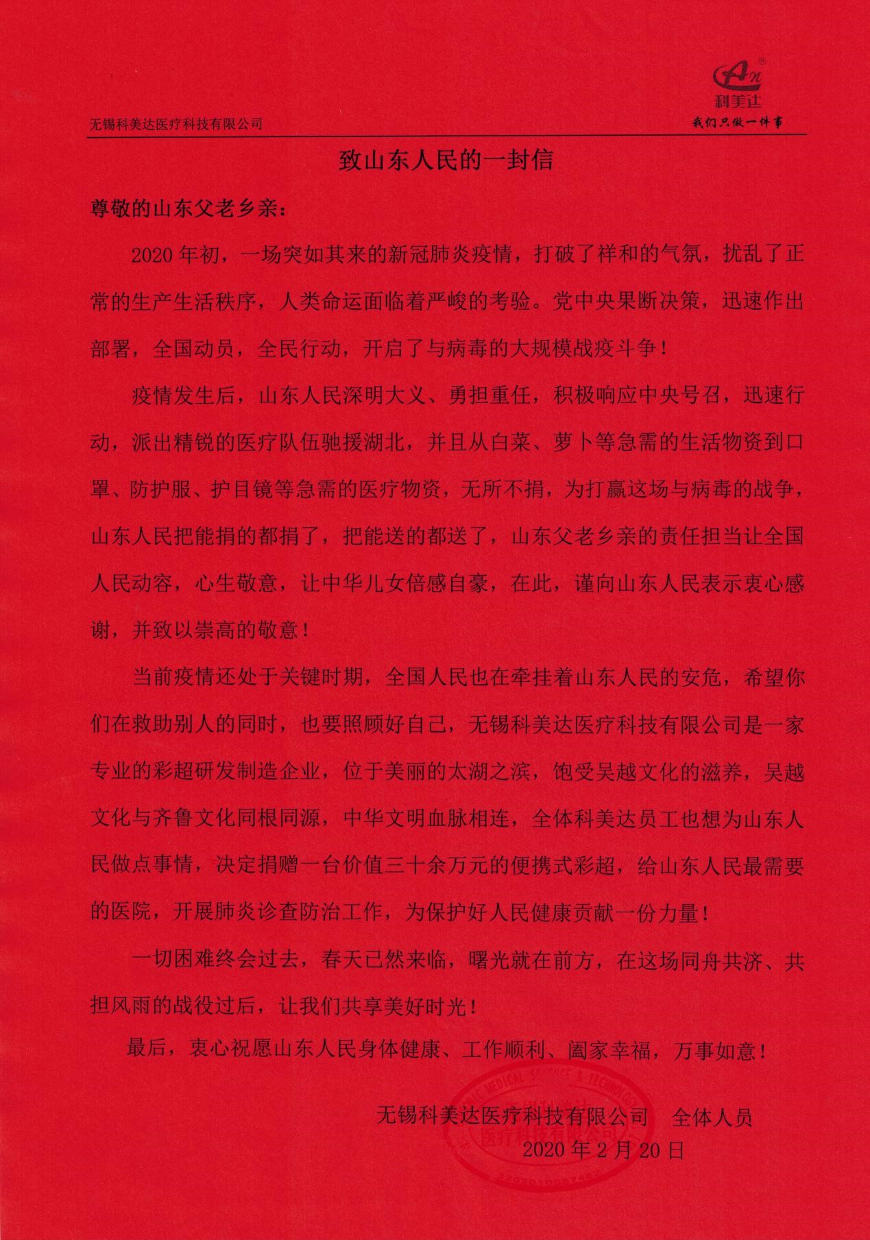 庚子年初,新冠肺炎疫情洶涌而來,隨著鐘南山院士馳援武漢指出新冠肺炎存在“人傳人”的現(xiàn)象,一場(chǎng)史無前例的疫情攻堅(jiān)戰(zhàn)在全國打響。武漢告急,全國馳援,從生活物資到醫(yī)療用品源源不斷往最需要的地方,山東人民搬家式的支援抗疫模式更是感動(dòng)了全國人民,彩超作為新冠肺炎病情診斷的重要手段,得到臨床專家的重視,為緩解疫情防控期間醫(yī)療物資緊缺狀況,有效防范醫(yī)護(hù)人員感染和疫情擴(kuò)散風(fēng)險(xiǎn),科美達(dá)公司主動(dòng)聯(lián)系山東省慈善機(jī)構(gòu),向濟(jì)南市鋼城區(qū)慈善總會(huì)定向捐贈(zèng)了價(jià)值38萬元的便攜式彩超設(shè)備,用于濟(jì)南市鋼城區(qū)醫(yī)院抗擊肺炎疫情和人民健康檢查,確保戰(zhàn)略后方穩(wěn)固。